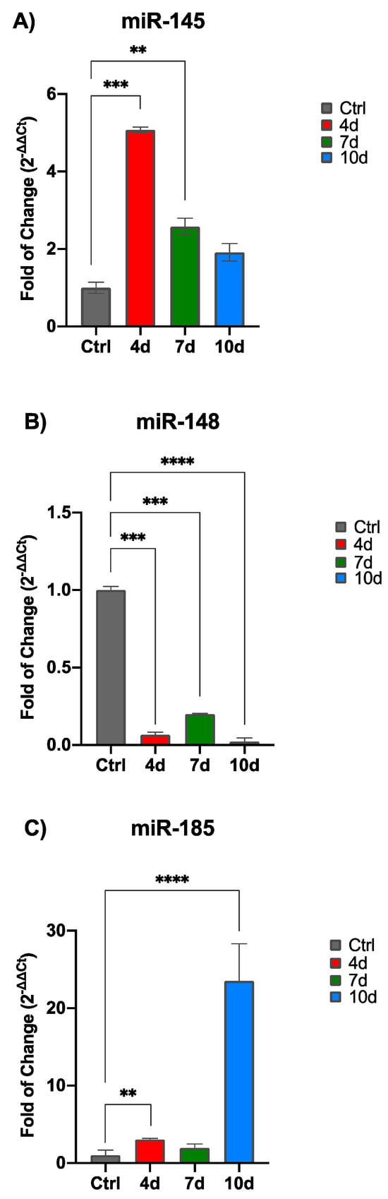 The expression of miR-145 (A), miR-148a (B), and miR-185 (C) was evaluated in adipose-derived stem cells (hADSCs) cultured with 4d-MCF-7-E.M (4 d: red bars), 7d-MCF-7-E.M (7 d: green bars), or 10d-MCF-7-E.M (10 d: blue bars). The mRNA levels for each gene were normalised to U6snRNA and expressed as the fold change (2−∆∆Ct) of the mRNA levels observed in untreated control hADSCs (Ctrl: grey bars), defined as 1 (mean ± SD; n = 6). Data are expressed as the mean ± SD relative to the control (** p ≤ 0.01), (*** p ≤ 0.001), (**** p ≤ 0.0001).