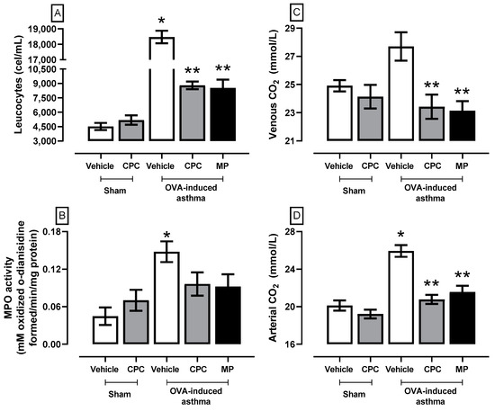 To check the asthmatic status of the rats and validate the model, after immunization and administration of OVA and the consequent treatments with the drug of choice (MP) and the novel alternative treatment (CPC), Figure 1 shows clinical pathology markers of asthma that rise in the OVA-induced asthma group, where there is leukocytosis, an increase in venous and arterial CO2 concentration and increased pulmonary MPO activity. On the other hand, CPC and MP denoted a decrease in the markers that were indistinct between the drug and the nutraceutical. Specifically, both prevent the increase of leukocyte presence (~50%), MPO activity (~35%), arterial CO2 concentration (~15%), and venous CO2 concentration (~17%).