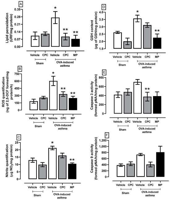 Effect of C-phycocyanin (CPC) on lipid peroxidation (A), ROS quantification (B), nitrite quantification (C), GSH content (D), and caspase 3 (E) and caspase 9 activities (F) in the lung of ovalbumin (OVA)-induced asthma in rats. Values represent the mean ± SEM. * p < 0.05 compared to the vehicle-sham group and ** p < 0.05 compared to the OVA-induced asthma group. One-way ANOVA and Student–Newman–Keuls post hoc test.