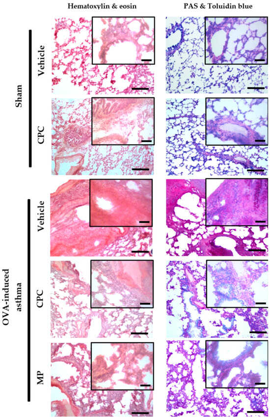 Figure 3 depicts the histopathological study of the lung. In sham groups, normal bronchiolar and alveoli cytoarchitecture was observed. It is characterized by alveolar ducts open to alveoli from the respiratory bronchiole, which is covered by low columnar ciliated cells. Blue toluidine and PAS stain shows the basal membrane without goblet cells. Also, most areas of the alveolar lumen are covered by flat cells, such as pneumocytes type I and II (stain H&E). Meanwhile, the asthmatic group without treatment promoted airway remodeling, which is an ongoing structural change that leads to thickened airway walls due to goblet cell hyperplasia (demonstrated by blue toluidine and PAS stain), subepithelial collagen deposition with increased thickness of the reticular basement membrane, and smooth muscle, as well as infiltration of multiple immunological cells promoting the mucus production. Additionally, the asthmatic rats treated with CPC and MP showed similar histopathological signs, such as mild airway remodeling process and lower inflammation than the asthmatic rats. Although both treatments prevented severe inflammation, only the MP treatment reduced the mucus production compared with the CPC treatment.