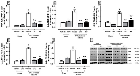 Effect of C-phycocyanin (CPC) on inflammation markers (A) TLR4, (B) NFκB, (C) NOS2, (D) COX2, and (E) CD68 in the lung of ovalbumin (OVA)-induced asthma in rats. (F) expression blot of all proteins by Western blotting technique. Values represent the mean ± SEM. * p < 0.05 compared to the vehicle-sham group and ** p < 0.05 compared to the OVA-induced asthma group. One-way ANOVA and Student–Newman–Keuls post hoc test.