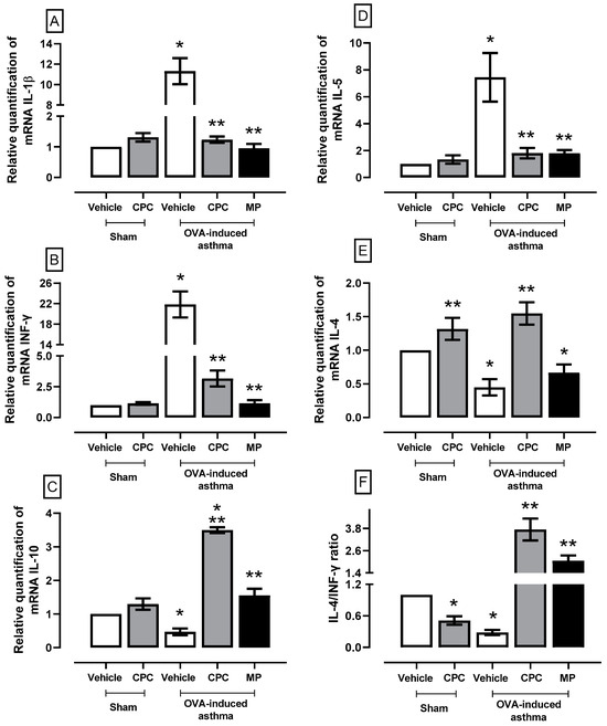 Effect of C-phycocyanin (CPC) on mRNA synthesis of cytokines such as (A) IL-1β, (B) INF-γ, (C) IL-10, (D) IL-5, (E) IL-4, and (F) IL-4/INF-γ ratios in the lung of ovalbumin (OVA)-induced asthma in rats. Values represent the mean ± SEM. * p < 0.05 compared to the sham-vehicle and ** p < 0.05 compared to the OVA-induced asthma group. One-way ANOVA and Student–Newman–Keuls post hoc test for all cytokines except for IL-4/INF-γ ratio were analyzed using Kruskal–Wallis one way-ANOVA and Student–Newman–Keuls post hoc test.