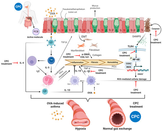 The CPC’s antioxidant properties have been reported to rely on its activity as a nucleophilic compound that neutralizes reactive oxygen species and free radicals. In the case of asthma, CPC can neutralize the excessive production of free radicals during allergen-induced inflammation and avoid tissue damage [19,30]. The PCB, a CPC metabolite, must be the molecule responsible for pharmacological actions because it is a nucleophilic compound that firstly compensates for the disturbance in the antioxidant system [31]. However, the most important action of CPC and PCB is immunomodulatory because several anti-inflammatory mechanisms are demonstrated in several pathologies. In ethanol-induced gastric ulcers, CPC down-regulates the expression of NFκB and inflammatory cytokines such as IL-1β and TNF-α [32]. Also, CPC in carrageenan-evoked thermal hyperalgesia has been shown to be associated with lower concentrations in paw exudate of TNF-α and PGE2 by down-regulating NOS2 and COX2 [33]. Meanwhile, CPC has a positive effect against acute myocardial infarction, causing down-expression of phospho-(Ser 536)-NFκB p65 and mRNA synthesis for IL-1β, IL-6, TNF-α, and INFγ [23]. In this sense, the NFκB must participate in the pro-resolving pathways induced by CPC treatment because, in the OVA-induced asthma model, there is a similar pattern of COX2, NOS2, and MPO expression, as well as the reduction of proinflammatory cytokines. We hypothesized this because OVA-induced asthma enhances the expression of TLR4 in the lung, which is associated with damage-associated molecular patterns (DAMPS) after hard inflammation due to allergen contact of sensitized cells [34]. In inflammatory airway diseases, such as asthma and chronic obstructive pulmonary disease, inhibition of TLR4 signaling has also been suggested to be a promising therapy by reducing neutrophil recruitment and activation [35].