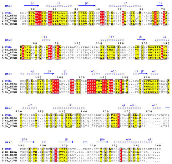 Alignment of the amino acid sequence of URH1p with representative members of the NH family. Secondary structure elements in the first line are derived from the URH1p crystal structure, here determined. Regions with strictly conserved amino acids are highlighted in red and similar ones in yellow and bold typeface. RihA and RihB are pyrimidine-selective NHs from E. coli, IU-NH is the non-specific NH from C. fasciculata, CUNH is the pyrimidine-specific NH from S. solfataricus.