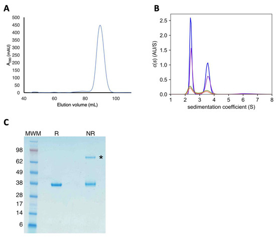 Sedimentation velocity (SV) analytical ultracentrifugation data were collected using a Beckmann/Coulter XL-I analytical ultracentrifuge (Beckman Coulter, Cassina de’ Pecchi (MI), Italy) equipped with a double-sector centrepiece with sapphire windows. Radial spectra were acquired in absorbance mode (280 nm) at five different protein concentrations (0.1, 0.2, 0.4 and 0.6 mg·mL−1, corresponding to 2.6, 5.2, 10.4 and 15.6 µM) at 45,000 rpm (163,004 g). The experimental curves were deconvoluted to c(S) distributions using the software SEDFIT v16-1c [50].