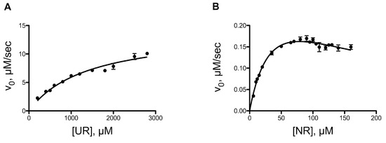 To further characterise the substrate specificity and catalytic efficiency of the enzyme, we performed a steady-state kinetic analysis of URH1p at 37 °C (Table 1, Figure 3). Unlike earlier studies, the present kinetic analysis was carried out in phosphate buffer since Tris was shown to interact with several conserved amino acid residues involved in the binding of substrates at the active site of both groups I and II NHs [11,18,35] and is expected to interfere with the determination of the initial velocities.
