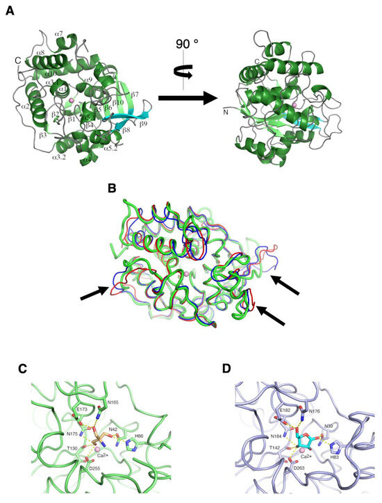 The asymmetric unit of the hexagonal crystals contains two URH1p monomers, covalently linked by a disulphide bridge involving residue Cys142 from both chains. The two monomers are very similar in structure (rmsd 0.06 Å for all atoms). Thus, the analysis presented here is carried out using the polypeptide chain termed “A” in the deposited PDB file. The URH1p structure retains the characteristic open (α, β) NH fold [27,30] that is composed of an eight-stranded central mixed β-sheet (β1-β7 and β10) surrounded by the connecting α-helices, a helical domain that completes the active site, and two additional antiparallel β-strands (β8 and β9) extending away from the core sheet (Figure 4A). Among the deposited, experimentally determined structures of NH enzymes, the URH1p structure shows the highest structural homology with the Crithidia fasciculata IU-NH (29% sequence identity) in complex with a transition state-like inhibitor (PDB 2MAS) (Figure 4B). A root mean square distance (rmsd) of 1.9 Å is computed over 313 aligned Cα atoms, while this value is reduced to 0.66 Å if computed using 192 structurally homologous Cα atoms with rmsd less than 2.0 Å. Thus, the core structure of URH1p closely resembles the three-dimensional architecture of group I NHs.