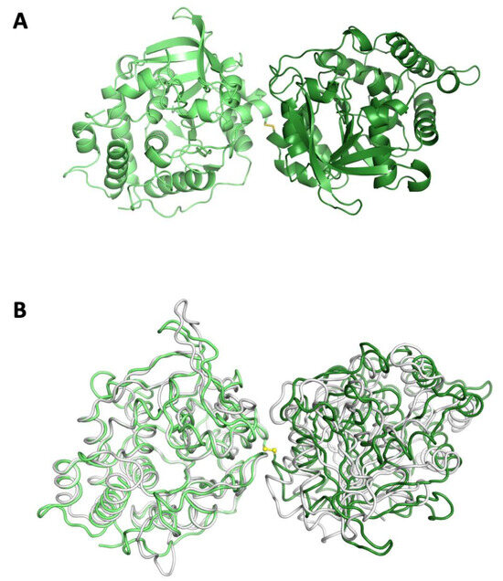 Disulfide-linked dimers in the URH1p crystals. (A) Ribbon diagram of the URH1p asymmetric unit content, showing the disulfide linkage between the two independent polypeptides coloured in different shades of green. (B) Superposition of the disulfide-linked URH1p polypeptides with the Crithidia IUNH dimer formed through minor surface interaction. The superposition was carried out using the atoms of one monomer (left portion of the panel), resulting in a significant displacement of the second subunit.