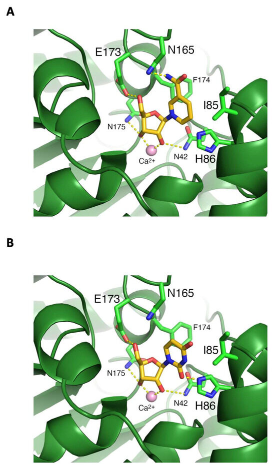 Modelling of the URH1p-substrate interactions. (A) The NR molecule positioned in the active site can interact with residue Asn165. (B) Uridine can be accommodated with the O2 carbonyl in close proximity to His86, which can stabilise the negative charge developing at the transition state.