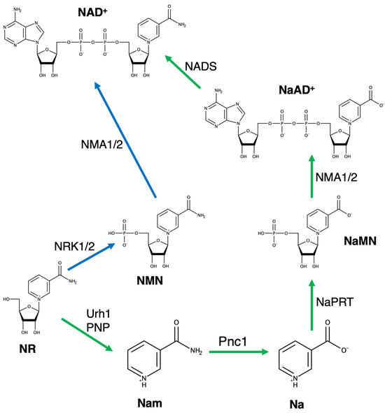 Metabolic pathways in eukaryotes involved in the conversion of nicotinamide riboside (NR) to NAD+. Blue arrows indicate the NR kinase (NRK1/2) dependent pathway and green arrows indicate the URH1/PNP-mediated conversion. NMA1/2 nicotinamide mononucleotide adenyltransferase; Pnc1, nicotinamidase; NaPRT, nicotinate phosphoribosyltransferase; NADS; NAD+ synthetase.