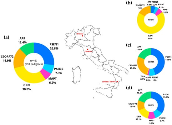 Overall, the most prevalent genetic group was that comprising GRN mutation carriers (144 [30.8%] of 467 individuals), followed by PSEN1 mutation carriers (125 [26.8%]), followed by individuals carrying C9orf72 expansion (79 [16.9%]), APP (58 [12.4%]), PSEN2 (34 [7.3%]), followed by the least common group with mutations in MAPT (29 [6.20%]) (Figure 1a). Moreover, we observed geographical variability in mutation frequencies by looking at each cohort of participants (Figure 1b–d).