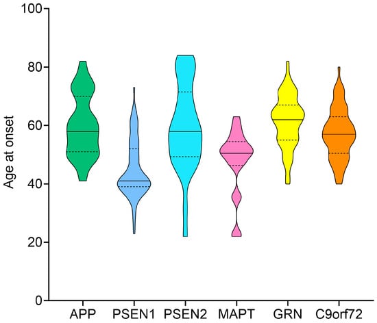 The analysis of phenotypic characteristics on the entire Italian cohort confirms previous studies regarding the high variability of age at onset across the genes implicated in AD and FTD. This variation is present not only at the gene level, but also between specific mutations in APP and PSEN1 genes. We observed a similar range of age at onset (about 40 to 82) for APP, GRN, and the C9orf72 genetic group. The largest range of age at onset was observed in the PSEN2 genetic group (22–84), while PSEN1, PSEN2, and MAPT were the genetic groups with the youngest age at onset (22 and 23 years). Interestingly, neither the origin nor the sex, but only the genetic group, were associated with age at onset.