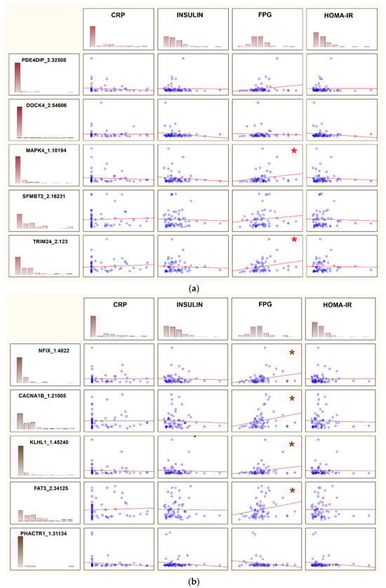 (a) Correlation between top 10 dysregulated transcripts and clinical variables (part 1). Abbreviations: CRP, C-reactive protein; FPG, fasting plasma glucose; HOMA-IR, Homeostatic Model Assessment of Insulin Resistance. Significant correlations are marked with a red star. Details are presented in Table 3. (b) Correlation between top 10 dysregulated transcripts and clinical variables (part 2). Abbreviations: please refer to Figure 1a. Significant correlations are marked with a red star. Details are presented in Table 3.
