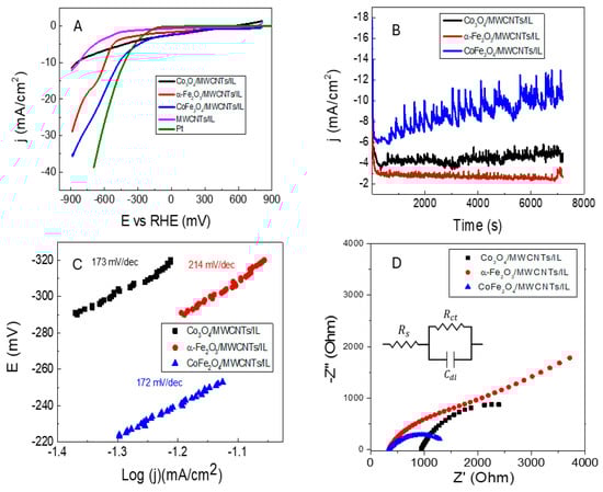 Ibarra J, Aguirre MJ, del Río R, Henriquez R, Faccio R, Dalchiele EA, Arce R, Ramírez G. α-Fe2O3/, Co3O4/, and CoFe2O4/MWCNTs/Ionic Liquid Nanocomposites as High-Performance Electrocatalysts for the Electrocatalytic Hydrogen Evolution Reaction in a Neutral Medium. International Journal of Molecular Sciences. 2024; 25(13):7043. https://doi.org/10.3390/ijms25137043