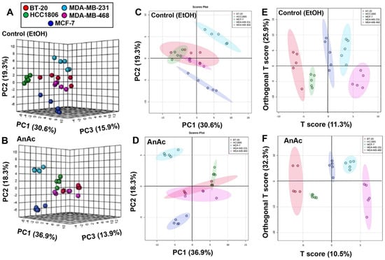 To determine whether the metabolomic signature of the cell lines differed between the control (EtOH) treatment and the AnAc treatment, we used MetaboAnalyst 6.0 software [33]. First, we performed unsupervised Principal Component Analysis (PCA) resulting in PCA score plots that visualized the effects of cell line and treatment on the cellular metabolome (Figure 2A–D). The 3D PCA score plots (Figure 2A,B) and 2D PCA score plots (Figure 2C,D) of the same samples reveal a distinct metabolic signature of MCF-7 (luminal A) and MDA-MB-231 (TNBC, basal B) cells from the other three TNBC cell lines: BT-20, HCC1806, and MDA-MB-468 (all basal A). PCA shows metabolic signatures for each cell line along the first principal component (PC1), explaining 30.6% (C) and 36.9% (D) of variance for the control and AnAc-treated cells, respectively. MCF-7 luminal A cells cluster in component 1 relative to the four TNBC cell lines in the second component with both control and AnAc treatment (Figure 2C,D). Taken together, the results of the PCA analysis reveal that the cell line has the most impact on the metabolic profiles. This is shown in a PCA analysis of all five cell lines +/− AnAc treatment in Supplementary Figure S2. Orthogonal Partial Least Squares-Discriminant Analysis (OPLS-DA), which better filtered out ‘noise’ within the five biological replicates in each cell line [34], revealed that each cell line had a distinctive metabolic cluster (Figure 2E,F). BT-20 and HCC1806 showed lower T scores in OPLS-DA compared to MCF-7, MDA-MB-231, and MDA-MB-468 cells (Figure 2E,F). OPLSA-DA score plots revealed distinct metabolic signatures with AnAc treatment of each cell line (Figure 2E,F).