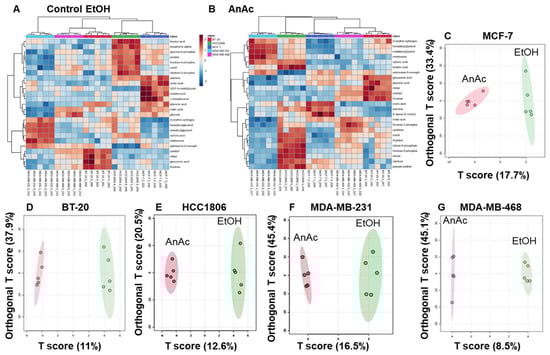 Metabolite differences between cell lines and in response to AnAc treatment. Heatmaps of unsupervised hierarchical cluster analysis of the top 25 metabolite concentrations in the metabolomics data from the control (EtOH) (A) and AnAc-treated (B) cell lines. The rows show different metabolites in EtOH (A) and AnAc-treated cells (B) with the columns indicating the individual cell lines. (C–G) OPLS-DA of metabolites from the control (EtOH) and AnAc-treated cell lines. (C): MCF-7, (D): BT-20, (E): HCC-1806, (F): MDA-MB-231, and (G): MDA-MB-468 BC cells. Each point is a separate replicate sample from the indicated cell lines. Each cell line was grown in 5% DCC-FBS-phenol red-free IMEM for 48 h prior to 24 h treatment with EtOH or AnAc. OPLSA-DA score plots identify distinct metabolic signatures with AnAc treatment of each cell line.