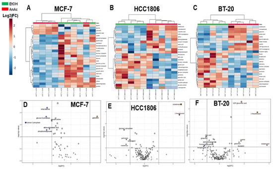 Analysis of AnAc-regulated metabolites in MCF-7, HCC1806 and BT-20 BC cells. Heatmaps of the top 25 identified metabolites from control (EtOH) and AnAc-treated MCF-7 (A), HCC1806 (B) and BT-20 (C) BC cells. Each column is an individual replicate. One AnAc-treated sample was sorted into the Control cluster. Volcano plots using a 2-fold cut off identified up and down-regulated metabolites in MCF-7 (D), HCC1806 (E) and BT-2 (F) BC cells. MetaboAnalyst identified selected metabolites (blue font). Red and purple dots indicate increased and decreased abundance, respectively.