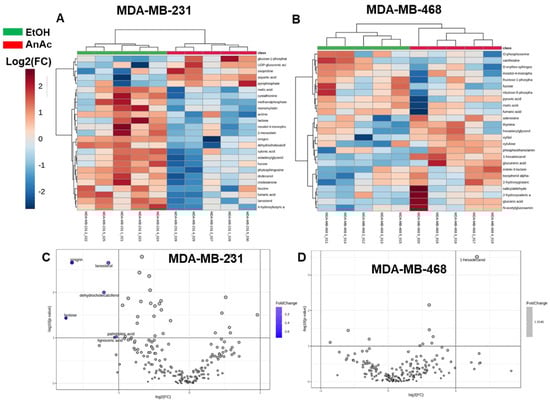 Analysis of AnAc-regulated metabolites in MDA-MB-231 and MDA-MB-468 TNBC cells. Heatmaps of the top 25 identified metabolites from control (EtOH) and AnAc-treated MDA-MB-231 (A) and MDA-MB-468 (B) TNBC cells. Each column is an individual replicate. One AnAc-treated sample was sorted into the Control cluster. Volcano plots using a 2-fold cut off identified up and down-regulated metabolites in MDA-MB-231 (C) and MDA-MB-468 (D) TNBC cells. MetaboAnalyst identified selected significant metabolites (blue font). Red and purple dots indicate increased and decreased abundance, respectively.