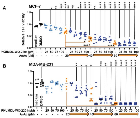 AnAc and PDGH inhibitor PKUMDL-WQ-2201 reduce MCF-7 and MDA-MB-231 cell viability. MCF-7 (A) and MDA-MB-231 (B) cells were treated with vehicle control (DMSO), PHGDH inhibitor PKUMDL-WQ-2201 or AnAc at the indicated concentrations for 48 h. MTT assays were performed and data were analyzed by one-way ANOVA followed by Tukey’s multiple comparison test. Individual values from two biological replicate experiments were plotted. * p < 0.05, ** p < 0.01, *** p < 0.001, **** p < 0.0001.