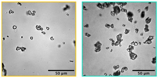 Microscopic visible images of aged PE microparticles (left) and aged PP microparticles (right).
