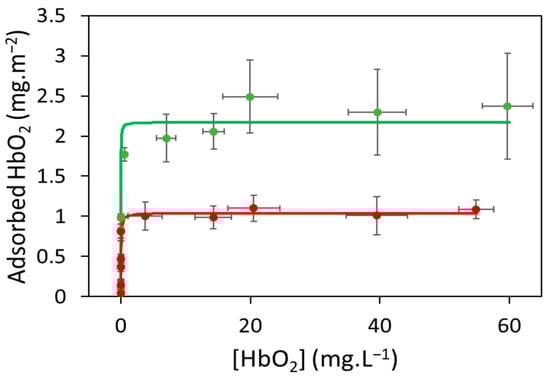 After the contact of the aged microplastics with Hb, the cream is less stable than with virgin microplastics, and the microparticles return more easily in solution. After sample centrifugation to remove plastic microparticles via creaming, it was very difficult to skim them from the surface of the solutions. Therefore, we determined the non-adsorbed Hb concentrations using diffuse reflection spectroscopy (see Section 3.4 and Section 3.5). The adsorption isotherms of oxyHb on ag-PEMPs and ag-PPMPs in 0.1 mol.L−1 phosphate buffer pH 7.0 are presented in Figure 3.