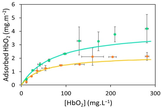 The adsorption isotherms of oxyhemoglobin on aged polyethylene (PE) microparticles (ag-PEMPs) (orange circles) and polyethylene (PP) microparticles (ag-PPMPs) (teal circles) in 0.1 mol.L−1 phosphate buffer pH 7.0. Experimental data (circles) and error bars correspond to the average and standard deviation of three biological replicates. Data were fitted using the Langmuir adsorption model (solid lines).