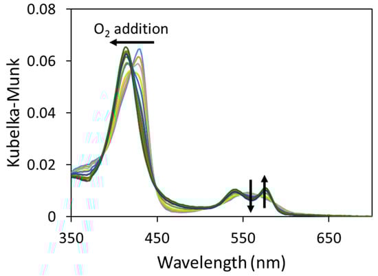 In tonometry experiments, to measure the UV–visible spectra of Hb adsorbed on PP-filters, we used an integration sphere, we measured the diffuse reflection spectra (Figure S10), and we applied the Kubelka–Munk transformation [,] to obtain spectra proportional to absorption spectra (see Section 3.5). The oxygenated and deoxygenated Hb spectra were acquired and then partially oxygenated Hb spectra after successive additions of oxygen following the same protocol as that of Hb solutions (Figure 4). The presence of isobestic points highlighted the equilibrium of only deoxygenated/oxygenated forms of Hb adsorbed on the PP-filter and a preservation of the oxidation state of its heme-iron. Due to the low intensity of the heme region, we only used the Soret band of these spectra to calculate the proportion of oxygenated hemoglobin.