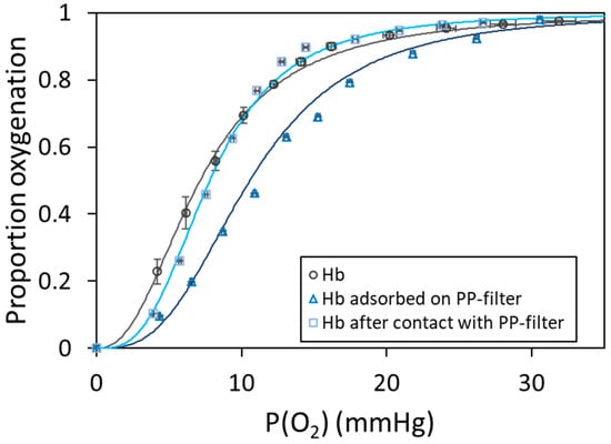 Oxygen binding curves: native hemoglobin (gray circles), hemoglobin adsorbed on the polypropylene filter (PP-filter) (light blue squares), and hemoglobin after contact with the PP-filter (dark blue triangles) in 0.1 mol.L−1 phosphate buffer pH 7.4. The fit using the Hill equation is shown (solid lines).