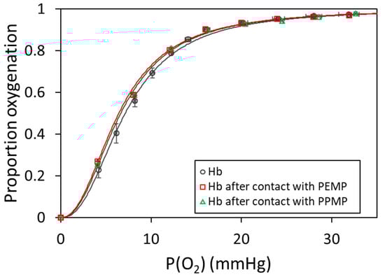 The oxygenation curves of hemoglobin after contact with PEMPs and Hb after contact with PPMPs are shown Figure 6. The curves are not very different from that of native Hb. The sigmoidal shapes reveal the cooperative binding and a slight increase in Hb affinity for oxygen. The Hill coefficient was 2.24 ± 0.03 for Hb after contact with PEMPs and 2.28 ± 0.03 for Hb after contact with PPMPs, but the P50, respectively, 6.43 ± 0.46 and 6.64 ± 0.46 mmHg were not significantly different from that of native Hb 7.09 ± 0.48 (Table 4).