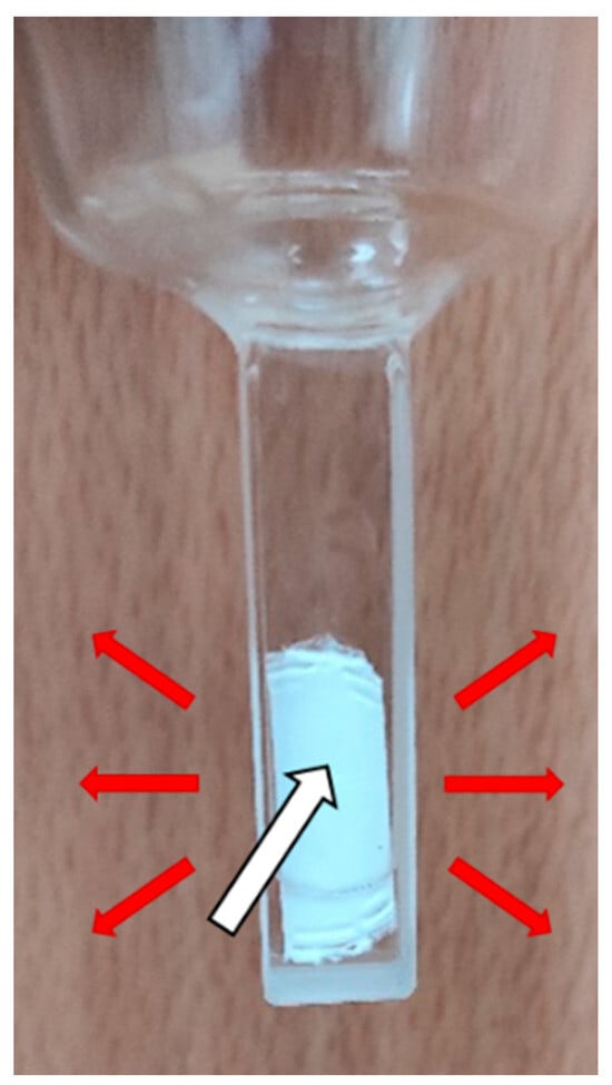 A polypropylene filter in a tonometer with 100 µL of 0.1 mol.L−1 phosphate buffer. The red color of adsorbed hemoglobin can barely be seen with the naked eye, but it can be detected and analyzed through diffuse reflection symbolized by the red arrows. The white arrow represents incident light.