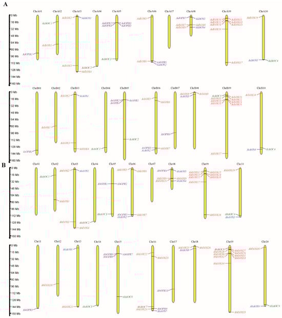 The distribution of the LOX, AOS, AOC, and OPR genes in A. duranensis, A. ipaensis (A), and A. hypogaea (B).