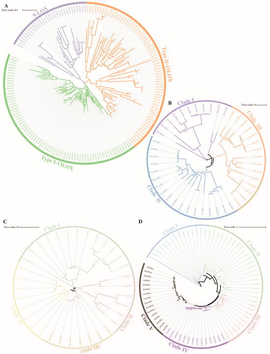 To understand the phylogenetic relationship and to classify the key enzyme genes of JA biosynthesis in peanut, maximum-likelihood trees were constructed based on the full-length amino acid sequences of LOXs, AOSs, AOCs, and OPRs from Arachis duranensis, Arachis ipaensis, Arachis hypogaea, Arabidopsis thaliana, Oryza sativa, Zea mays, Glycine max, Cicer arietinum, and Phaseolus vulgaris (https://phytozome-next.jgi.doe.gov/; accessed on 16 April 2024) [67]. All of the above proteins have been identified to contain the characteristic structural domains of the family by the HMMER web server (https://www.ebi.ac.uk/Tools/hmmer/; accessed on 28 April 2024) [38]. Phylogenetic trees were constructed by MEGA11 software [68].