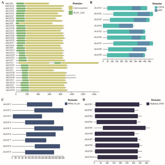 In order to determine the presence of conserved domains, key enzyme genes of JA biosynthesis were filtrated by the CDD database (Figure 3). The results confirmed that the lipoxygenase domain, p450 domain, Allene_ox_cyc domain, and Oxidored_FMN domain were successfully detected in AhLOXs, AhAOSs, AhAOCs, and AhOPRs, respectively. As one of the branches of the p450 superfamily, the CYP74 domain is the typical characteristic and distinguishing basis of the AOS gene family. At the same time, a lipoxygenase domain and a PLAT_LH2 domain exist simultaneously to be considered a member of the LOX family. The analysis revealed that all members of AhLOXs, AhAOSs, AhAOCs, and AhOPRs contained characteristic domains of their family.
