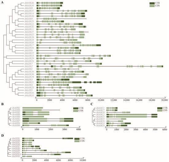 The number of introns and the way introns are inserted may be the cause of gene evolution and functional differentiation. In this study, the exon–intron organizations of all the identified JA biosynthesis genes were examined to gain more insight into the evolution in allotetraploid peanut. The phylogenetic tree and gene structure were integrated together as shown in Figure 4. The number of introns of AhLOX varied from 6 to 14 (Figure 4A). Eight AhAOS genes were with or without one intron (Figure 4B). In addition to AhAOC8, the other eight AhAOC genes contained one or two introns (Figure 4C). All OPR genes had fewer than five introns (Figure 4D). The above results implied that the genes within the same family had similar genetic organization. The high number of introns in the AhLOX gene indicated that the biological functions of this family might be more complex than those of the other three families.