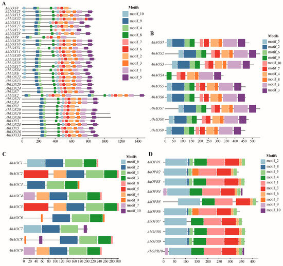 Distribution of conserved motifs of JA biosynthesis-related enzyme genes in A. hypogaea. (A) AhLOXs; (B) AhAOSs; (C) AhAOCs; (D) AhOPRs. Various conservative motifs are represented by different colors.