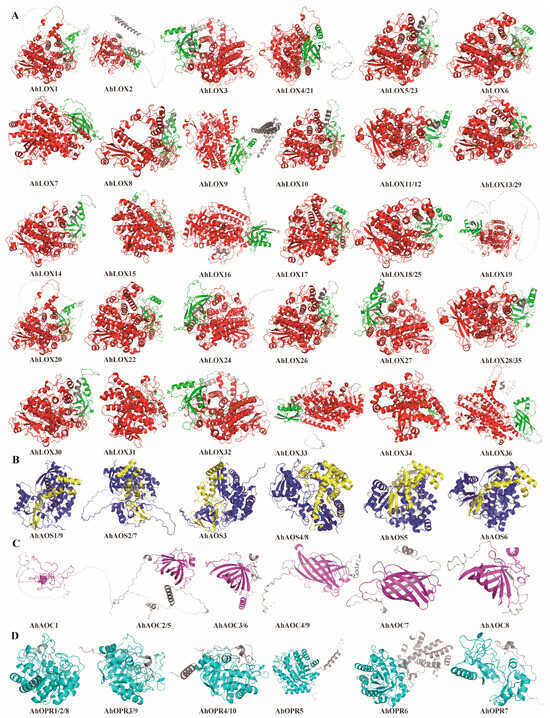 Structure and function are compatible, and the structure of a protein determines its biological functional properties. Protein secondary structure prediction showed that all key enzyme proteins of JA biosynthesis have four structures, the alpha helix (Hh), extended strand (Ee), beta turn (Tt), and random coil (Cc), with Cc having the highest percentage of 59.04–36.01% and 46.13–10.04%, followed by Hh and Ee with 10.04–46.13% and 11.65–34.87%, respectively, and Tt with the lowest percentage of 9.76–4.04% (Table S10). In addition, the 3D structures of all proteins were predicted using the protein structure database AlphaFold and visualized using PyMOL software (version 2.5.5; https://pymol.org/2/; accessed on 12 April 2023), and it was found that all proteins contained conserved subunits of subfamilies to which they belonged (Figure 6). The results of the 3D protein structure prediction analyses confirmed that the key enzymes of JA biosynthesis showed a high degree of conservatism among and within the subgroups. The key enzyme proteins of JA biosynthesis were categorized into four types based on their 3D structures and six core structural domains were defined: the PLAT_LH2 structural domain located at the N-terminal and lipoxygenase domain located at the C-terminal of AhLOX protein, the CYP74 structural domain presented in AhAOS protein and p450 domain in the middle, and the Allene_ox_cyc domain at the C-terminal of AOC protein and Oxidored_FMN domain anchored in the middle of OPR protein. This suggested that the higher the amino acid sequence similarity between the proteins, the more similar their 3D structures and the more similar their functions were.
