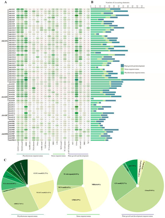 Cis-regulatory elements in the promoters of peanut JA biosynthesis-related enzyme genes. (A) Distribution of various cis-regulatory elements in AhLOX, AhAOS, AhAOC, and AhOPR promoter regions. (B) Number of elements in different families is counted. (C) Classification and percentage of different cis-regulatory elements.