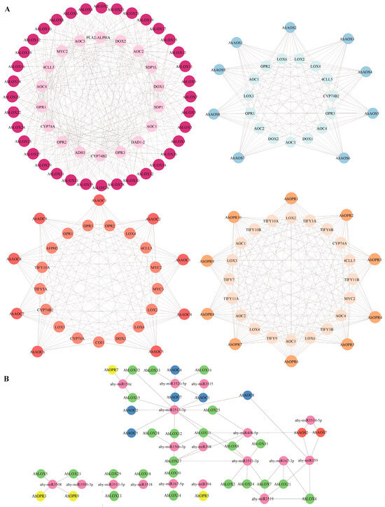 Interactions and regulation networks of genes involved in JA biosynthesis of peanut. (A) Predicted protein–protein interaction network of AhLOXs, AhAOSs, AhAOCs, and AhOPRs. (B) Regulatory network of putative miRNAs and their targeted candidate genes. Yellow, green, blue, and orange circles represent target genes. The pink circles represent miRNAs. The putative regulatory relationships between miRNAs and their targeted JA biosynthesis-related enzyme genes are shown as gray lines.