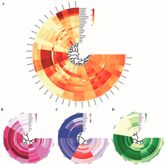 While perianths, stamens, pistils, pegs, pods, and seeds play important reproductive development roles as reproductive organs, AhLOX3-6, AhLOX8-11, AhLOX14-19, AhLOX21-23, AhLOX25-26, AhLOX30, AhLOX32-36, AhAOS1, AhAOS3-6, AhAOS9, AhAOC3-4, AhAOC6, AhAOC9, AhOPR1, AhOPR3-4, and AhOPR7-10 were highly expressed in these tissues, demonstrating that these genes may control reproductive development of peanut.