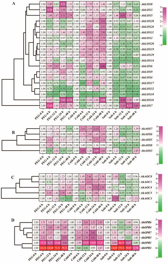 Most of the genes were up-regulated under cold stress. AhLOX11, AhLOX19, AhLOX20, AhLOX29, AhAOS3, AhAOS6, AhAOS7, AhAOC1, AhAOC4, AhAOC8, AhOPR5, and AhOPR7 were up-regulated about 2-fold at 6 h under cold stress; AhLOX2, AhLOX6, AhLOX11, AhLOX17, AhLOX19, AhLOX26, AhLOX29, AhAOS7, AhAOC1, AhAOC8, AhOPR1, and AhOPR5-7 were up-regulated to more than 2-fold transcript levels at 12 h of cold stress treatment compared to the control. The expression of AhLOX20, AhAOS5, AhAOS7, AhOPR1, AhAOC1, AhAOC4-5, AhAOS3, and AhOPR5-7 was up-regulated more than 2-fold at 24 h of cold stress treatment, with more than a 5-fold up-regulation of AhOPR1 and AhAOS3. The transcript levels of AhLOX2, AhLOX5-6, AhLOX11, AhLOX16, AhLOX19-20, AhLOX26, AhLOX28, AhAOS3, AhAOS5-7, AhAOC4, AhOPR1, and AhOPR5-6 were more than 2-fold compared to those of the control at 48 h of cold stress, with more than 5-fold for AhOPR1 and AhLOX16. It is a remarkable fact that the AhOPR1, which performed well under drought stress, showed a trend of up-regulation at 12 h, while AhOPR3 was not slightly expressed until 48 h.