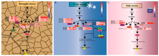 To investigate whether the expression of JA biosynthesis genes was influenced by abiotic stress and related signaling at the transcriptional level, further expression profiling was discovered under drought, cold, and salt stress for 0 h, 6 h, 12 h, 24 h, and 48 h (Figure 10; Table S15). The results are consistent with our hypothesis; the expression of many JA genes demonstrated significant changes under abiotic stress.