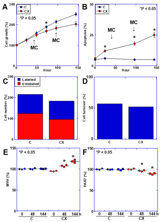 Next, we examined changes in the kinetics of C2C12 cells using an in vitro CX model (Figure 1). The CX model showed decreased proliferative activity (Figure 1A) and increased apoptosis (Figure 1B). The cell turnover was slightly lower in the CX model than that in the control group (Figure 1C). The levels of myosin heavy chain-8 (MYH8), which indicates skeletal muscle regeneration ability, and paired box protein-7 (PAX7), which indicates differentiation ability, were decreased in the CX model (Figure 1D,E).