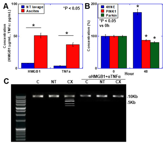 Measurement of the levels of inflammatory cytokines (HMGB1, tumor necrosis factor-alpha [TNFα]) and lipid peroxides (4HNE) in the cancer ascites (Figure 3A) showed increased levels for all cytokines compared with the control mouse peritoneal lavage. To examine the effect of inflammatory cytokines, we treated the cells with HMGB1 and TNFα for 48 h at concentrations equivalent to those in the cancer ascites (50 μg/mL and 35 pg/mL, respectively) and examined the changes in 4HNE, PINK1, and Parkin (Figure 3B). Both HMGB1 and TNFα treatment results in increased 4HNE levels and decreased PINK1 and Parkin levels. Further examination of mitochondrial DNA deletion in skeletal muscle when the mouse cachexia model was treated with neutralizing antibodies against HMGB1 and TNFα (Figure 3C) showed mitochondrial DNA deletion in the non-antibody-treated group but not in the antibody-treated group.