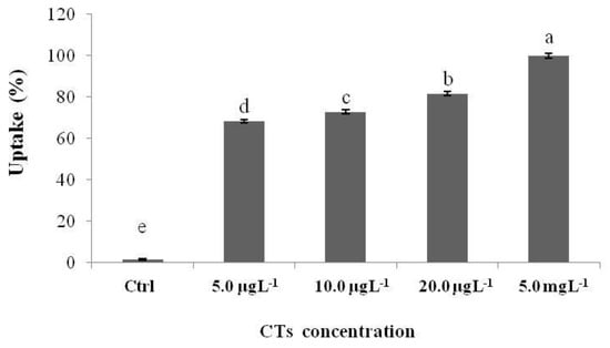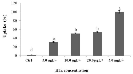 | 10.0 μgL−1 | 38.5 ± 2.9 b | 2.8 ± 0.7 c |