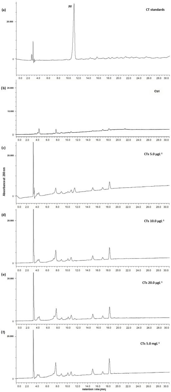 | 20.0 μgL−1 | 383.3 ± 5.1 a | 7.8 ± 1.8 b |