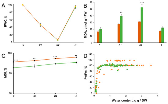 (A) Relative water content, (B) Lipid peroxidation, and (C) Membrane stability index in the hydrated control (C), after 50% desiccation (D1), after 90% desiccation (D2), and rehydration (R) of the thalli X. parietina. (D) FV/FM during desiccation. Absolute values of FV/FM in the control were 0.739 ± 0.050 for bright-orange thalli and 0.724 ± 0.017 for acetone-rinsed thalli. For all graphs, orange designates bright-orange thalli, while green designates acetone-rinsed thalli. Values are plotted as means ± SE, statistically significant differences are indicated as p ≤ 0.01 (**), ≤ 0.001 (***).