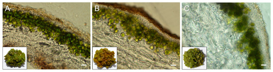 The cross sections of pale (A), bright-orange (B), and acetone-rinsed (C) thalli of X. parietina. Bar = 25 μm. Inserts represent the photographs of the whole thalli.
