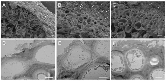 SEM and TEM images of cross sections from pale (A,D), bright-orange (B,E), and acetone-rinsed (C,F) thalli of X. parietina. White arrows indicate needle-shaped crystals of parietin. Bar (A–C) = 2 µm, (D–F) = 1 µm.
