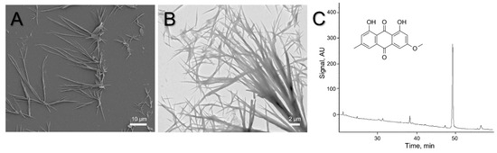 Microscopy observations of dried acetone extract demonstrated the presence of irregular needle-shaped crystals (Figure 4A,B). The morphology of parietin extracted from X. parietina was similar to the morphology of commercial parietin in the bright-yellow acetone solution that also appeared as needle-shaped crystals [41]. The identity of parietin was confirmed by high-performance liquid chromatography (HPLC) analysis; the major peak elution profile of the acetone extract corresponded to that of the parietin standard (Figure 4C).