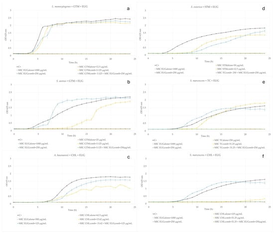Additionally, a comprehensive kinetic growth study was conducted on the six synergistic interactions, as shown in Figure 1, to unravel the behavior of each microorganism over a 24 h period under controlled conditions. It was observed that the combined administration of commercial ABXs and EUG, both at their MICcomb (see Section 3.5 for a definition of MICcomb) led to a complete inhibition of bacterial growth across all instances. These graphs also depict the total growth inhibition in experiments when natural and commercial ABXs were individually administered at their respective MICalone (see Section 3.5 for a definition of MICalone) and the non-inhibition when tested alone but at their respective MICcomb. However, even at subinhibitory concentrations of both the ABX and the natural product, some interesting facts can be extracted. The most pronounced effect observed in the graphs is related to the prolongation of the lag-phase. The lag-phase when the ABX was tested alone at its MICcomb was elongated for all experiments except for GTM-EUG-L. monocytogenes (Figure 1a) and CHL-EUG-A. baumannii (Figure 1c). However, when EUG was tested in these same circumstances, the lag-phase was modified only for S. enterica (Figure 1d). This fact was previously observed by Silva et al. [] on P. aeruginosa when EUG was tested at subinhibitory concentrations. They suggested that this behavior could be attributed to interactions between it and primary non-vital target sites of bacteria.
